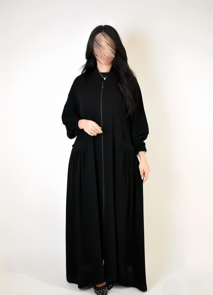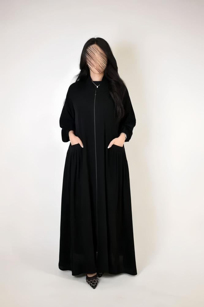 - تم استخدام قماش كريب لمار المعروف بنعومته الفائقة وانسيابيته العالية، ما يمنح العباية مظهرًا أنيقًا وثباتًا مثاليًا أثناء الحركة دون أن تفقد شكلها.