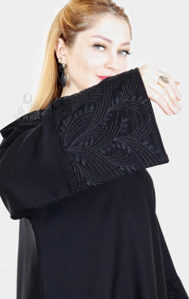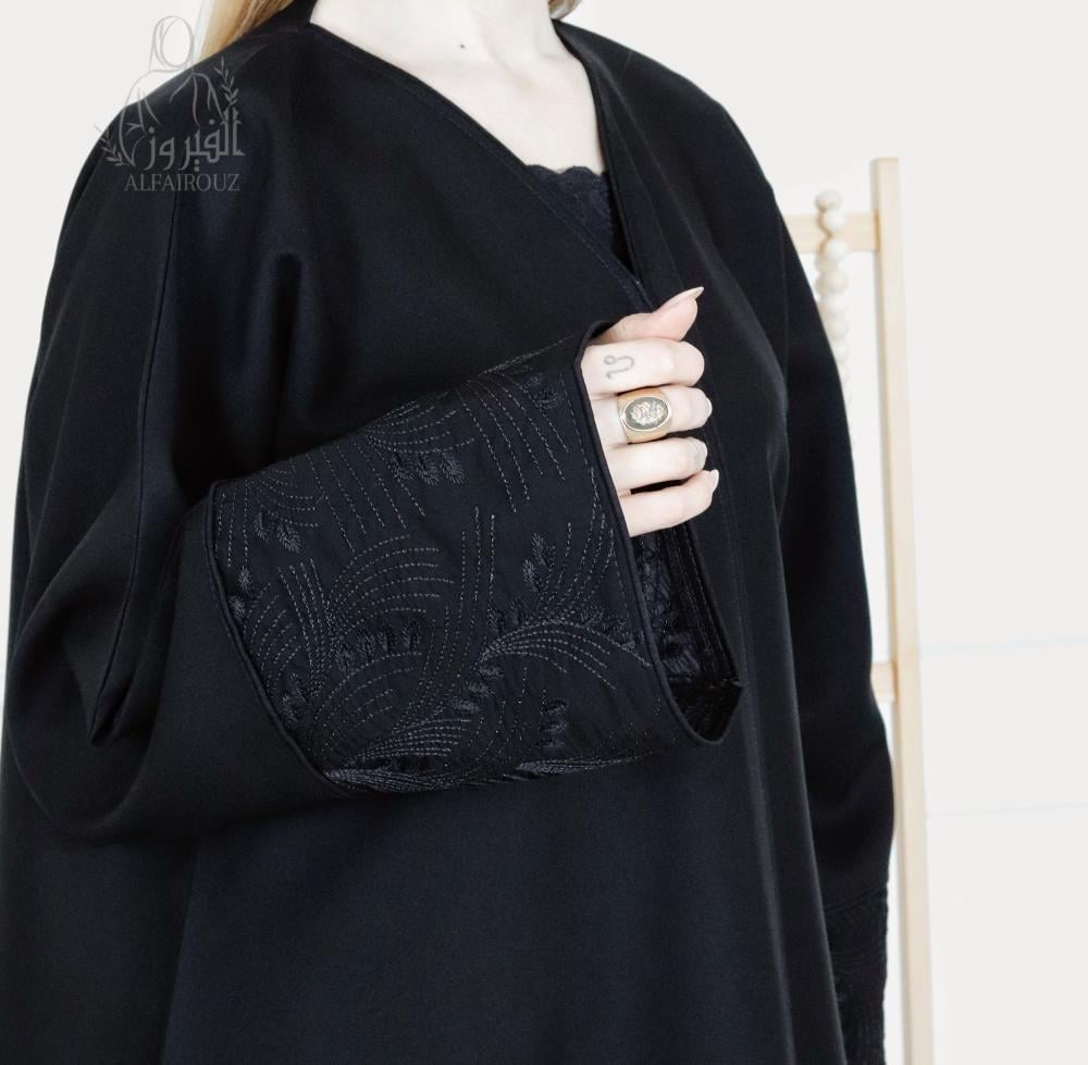 نوع اكمام العبايه :كم عبايه واسع على شكل مربع بتطريز اسود لماع .